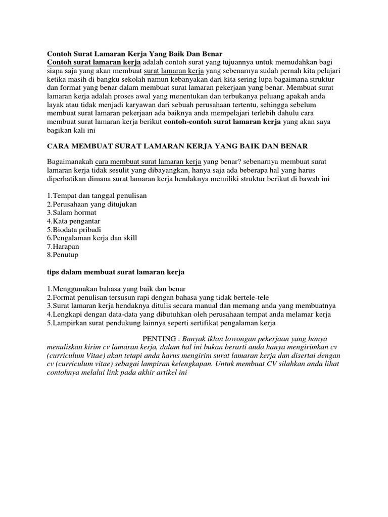 Contoh Surat Lamaran Kerja Pt Yg Baik Dan Benar Berbagi Lamaran from imgv2-1-f.scribdassets.com Contoh surat perintah kerja yang baik dan benar akan memudahkan pekerja karyawan atau orang yang diberikan wewenang untuk melaksanakan suatu tugas atau pekerjaan. Struktur pembuatan surat & jika ingin custom; Yaitu introduction atau pengenalan, yang berisi mengapa pelamar kerja menulis surat lamaran pekerjaan.yang kedua adalah content atau isi, paragraf ini membahas kualifikasi yang relevan dan the last adalah closing dengan kata lain adalah penutup, yang berisi ucapan terima kasih dan memberikan atau mecantumkan informasi kontak dan. Karena karyawan perusahaan belum pernah bertemu dengan anda, ada baiknya anda mengemas contoh surat lamaran kerja menjadi informasi yang tidak hanya tentang kondisi anda. Tak hanya itu, di dalam file ini ada beragam surat lamaran kerja sesuai dengan posisi kerja yang Apr 27, 2021 · salah satunya dengan membuat surat lamaran kerja yang menarik dan berisi informasi yang baik. Dokumen surat lamaran doc & pdf; Contoh surat lamaran dari berbagai bidang;